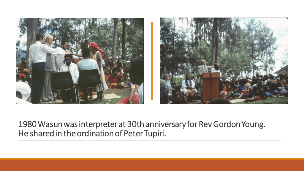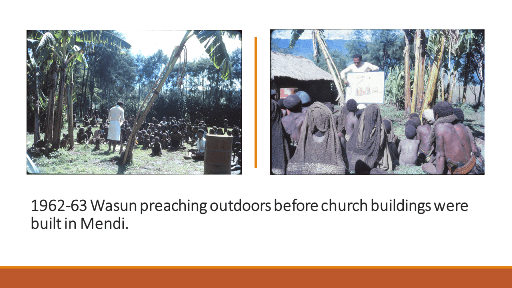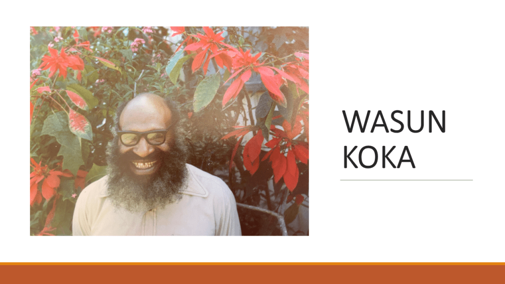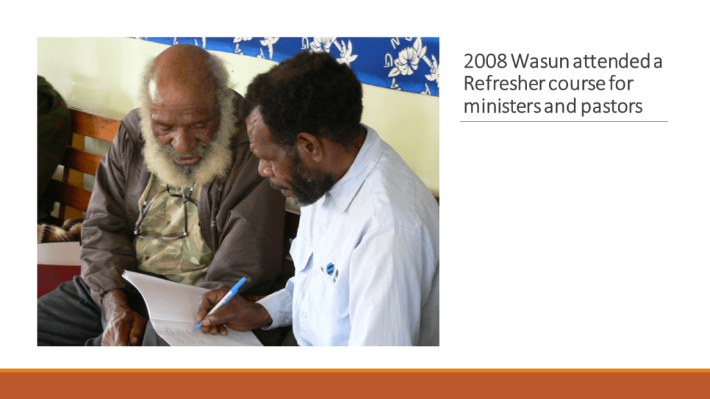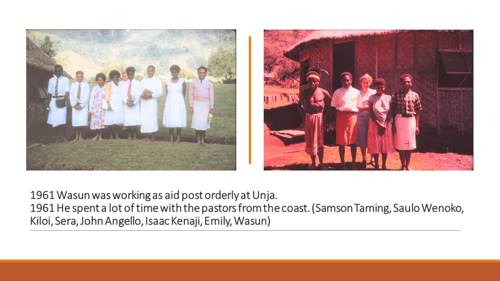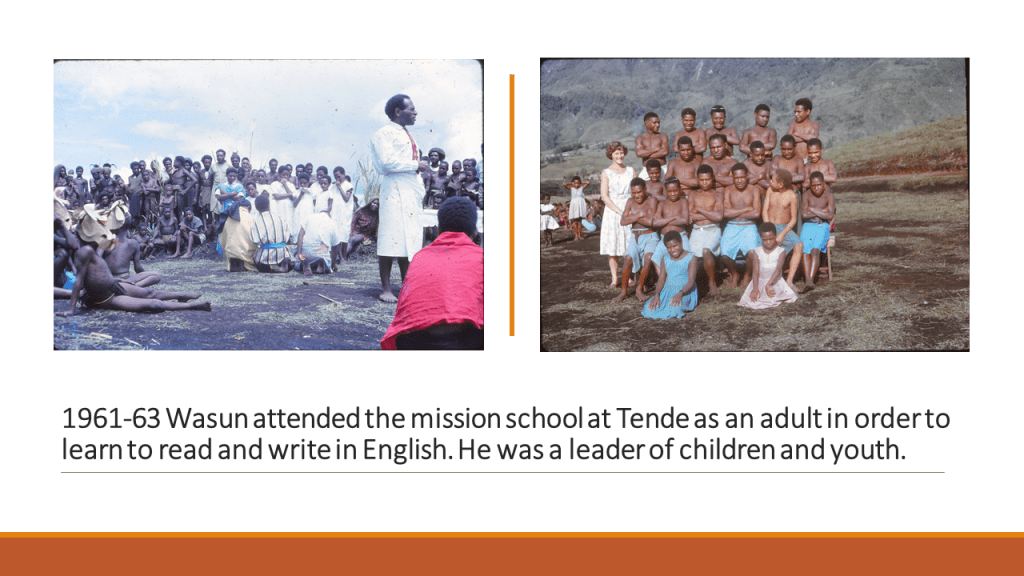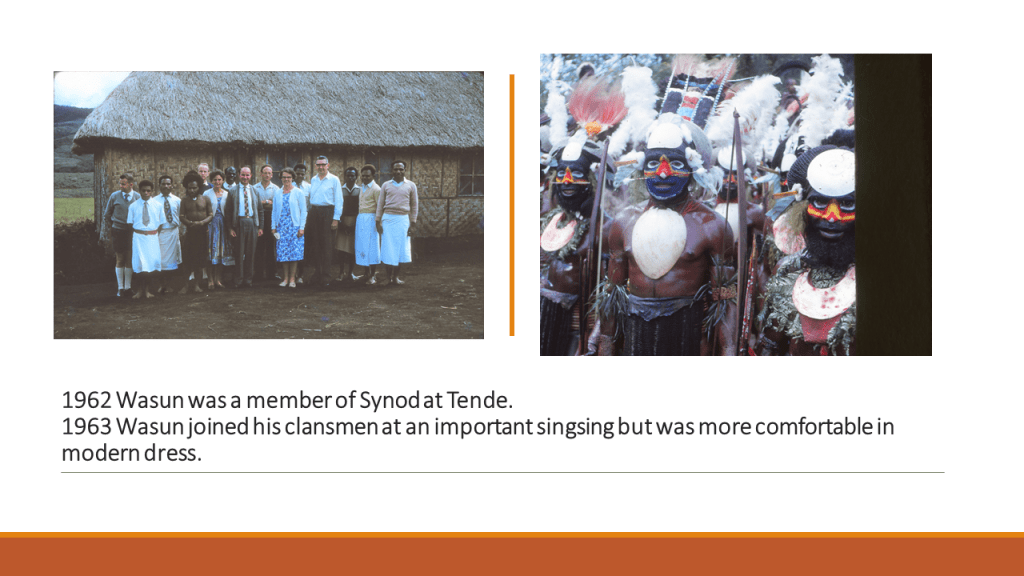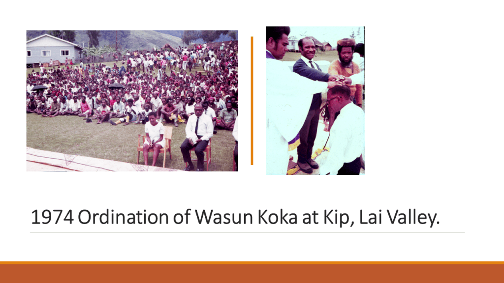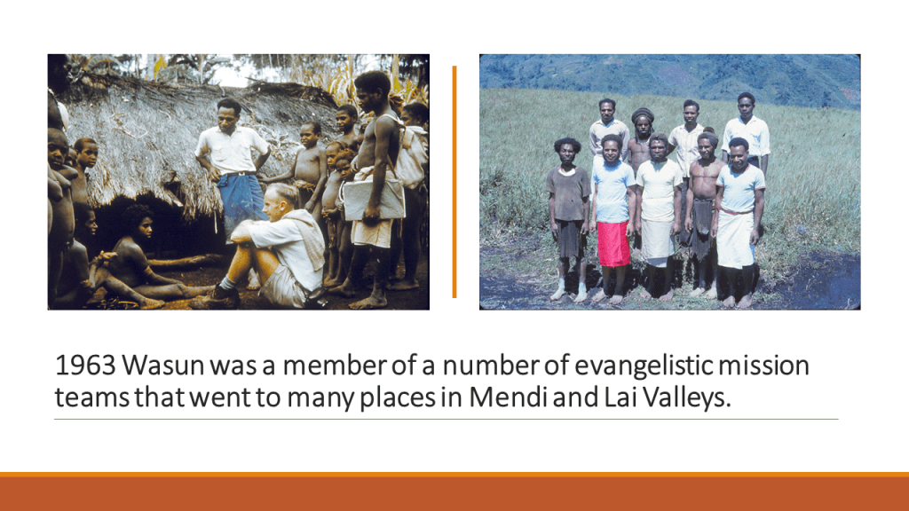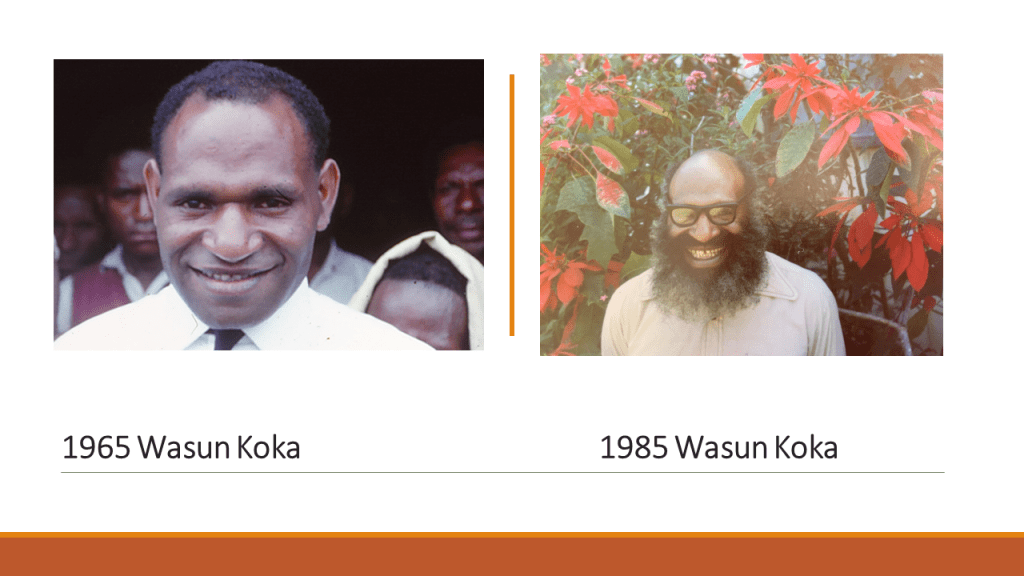 Rev Wasun Koka was the first Christian convert in the Methodist Mission in the Mendi region. He was baptised in May 1961. He became a leader among his people. In 1965-66 he studied at Methodist Bible college in Brisbane and in 1968-70 he studied at Rarongo Theological College. Wasun was ordained as a minister and served for many years in Highlands Region and Port Moresby. His influence has been very important and he was highly respected.