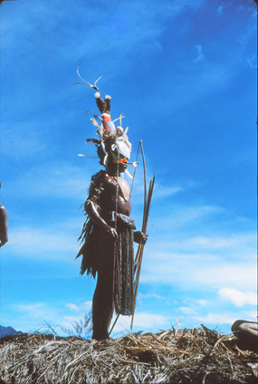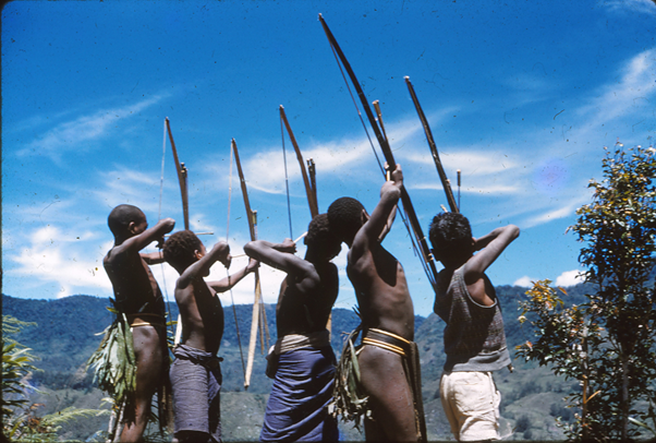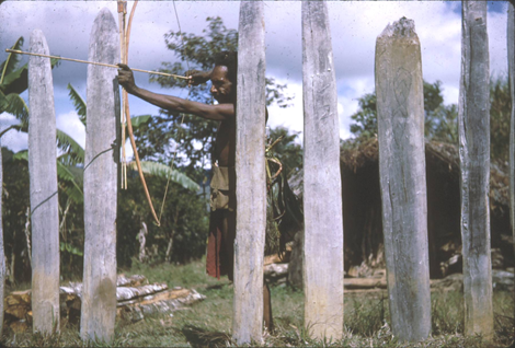 Clockwise from left: Mendi training with bows (Reeson 1962); Mendi man dressed for sing-sing (Reeson 1962); Mendi defensive fence with armed man (Smith 1963)
