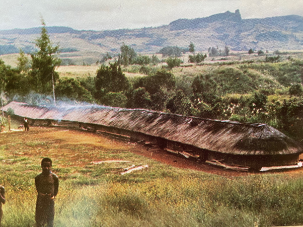 At 2.30 am the next morning we went to the Tege house, specially constructed for the initiation where we watched part of the initiation. A platform ran down each side and a long fire was lit along the centre. Men stood on the platform with bundles of switches and, as at regular intervals, a boy ran down the centre over the fire, the men chanted and struck him with switches.